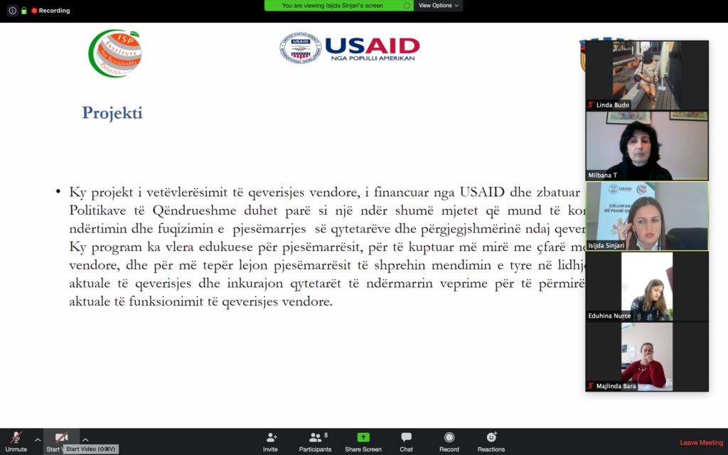 Sot zhvilluam një seancë trajnimi me tanë në kuadër të projektit “Sjellim bashkinë më pranë qytetarëve” zbatuar nga Instituti i Politikave të Qëndrueshme në bashkëpunim me Bashkia Kamez. Ky projekt është pjesë e skemës së granteve të projektit “Accelerated Civic Development and Cooperation project in Albania” zbatuar nga ANTTARCdhe financuar nga USAID/Albania. Në takimin virtual, […]
